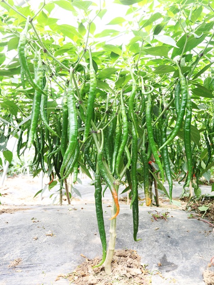 品種來(lái)源:JNF1×SRM1 特征特性:鮮食。雜交種,中晚熟,平均株高106.2厘米,平均株幅112.4厘米,全生育期168天,始收期67天;始花節位8~9節;平均果實(shí)縱徑25.6厘米,平均果實(shí)橫徑1.42厘米,平均肉厚0.26厘米;果實(shí)線(xiàn)形,青熟果綠色,老熟果紅色;平均單株結果數34個(gè),單果重37.3克。維生素C含量128.7毫克/100克,辣椒素含量0.23%。中抗病毒病CMV,感病毒病TMV,感疫病,中抗炭疽病,耐高溫,不耐高濕。第1生長(cháng)周期畝產(chǎn)2620千克,比對照華一1849增產(chǎn)3.1%;第2生長(cháng)周期畝產(chǎn)2400千克,比對照華一1849增產(chǎn)0.8%。