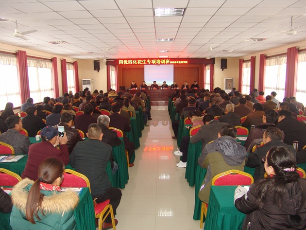 1月11日至12日,河南省“四優(yōu)四化”科技支撐行動(dòng)花生專(zhuān)項培訓會(huì )在我市平橋區職教集團公共實(shí)訓集地開(kāi)班。省農科院經(jīng)作所黨委書(shū)記、“四優(yōu)四化”花生專(zhuān)項“優(yōu)質(zhì)高油高油酸花生綠色安全高效生產(chǎn)技術(shù)集成與推廣”負責人湯豐收研究員,“高油花生綠色安全高效生產(chǎn)技術(shù)集成、示范”專(zhuān)題和“高油酸花生綠色安全高效生產(chǎn)技術(shù)集成、示范”專(zhuān)題負責人以及平橋區各鄉鎮農業(yè)發(fā)展中心負責同志、農技人員、花生種植大戶(hù)等150余人參加了培訓會(huì ),我院總農藝師段斌副研究員主持了會(huì )議。