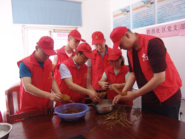 我院組織了10余名志愿者們來(lái)到鐵西社區參加包粽子送愛(ài)心活動(dòng);顒(dòng)現場(chǎng)一片互幫互助的和樂(lè )景象,志愿者們分工明確,相互協(xié)作,一邊包粽子,一邊和社區的工作人員相互交流學(xué)習。不一會(huì )兒功夫,一只只飽滿(mǎn)的愛(ài)心粽就呈現在了大家面前。