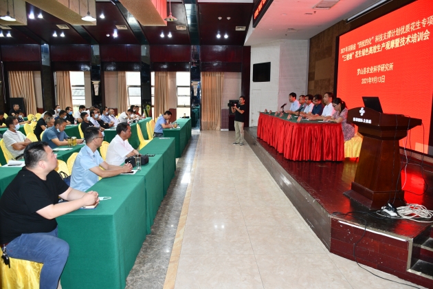9月13日,由我院主辦的河南省“四優(yōu)四化”科技支撐計劃優(yōu)質(zhì)花生專(zhuān)項,信陽(yáng)市“三坡”地花生綠色高效生產(chǎn)觀(guān)摩暨技術(shù)培訓會(huì )在羅山縣召開(kāi)。省農科院王振宇副研究員、司賢宗博士,我院油料所所長(cháng)金開(kāi)美、副所長(cháng)余明慧,羅山縣農科所所長(cháng)姜明波出席會(huì )議。羅山縣各鄉鎮花生種植大戶(hù)代表80余人參加了會(huì )議。