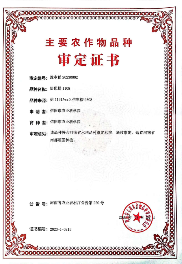 信優(yōu)糯1108(審定編號:豫審稻20230002)屬三系雜交糯稻新品種。全生育期142天,株高122.7厘米,平均畝有效穗16.0萬(wàn)穗。2022年參加生產(chǎn)試驗,平均畝產(chǎn)稻谷680.9公斤。稻米品質(zhì)達《優(yōu)質(zhì)稻谷》糯稻標準,適宜在河南省南部稻區種植。