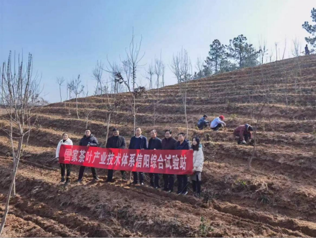 茶樹(shù)新品種示范任務(wù)是體系重點(diǎn)工作任務(wù)之一,信陽(yáng)綜合試驗站緊緊圍繞品種研究室工作安排部署,注重任務(wù)細化分解,壓實(shí)壓緊責任,確保任務(wù)高效實(shí)施。本年度引進(jìn)、示范茶樹(shù)新品種中黃3號、中茶125、黃金芽等,并在平橋區、羅山縣、新縣建立新品種示范基地,配套無(wú)性系良種茶樹(shù)栽培管理技術(shù)服務(wù),提高種苗成活率,達到示范引領(lǐng)的作用。高標準開(kāi)墾新茶園打牢建園基礎,在太平山茶業(yè)有限公司,試驗站品種團隊查看地形地勢條件,現場(chǎng)技術(shù)指導坡度為15°~25°丘陵山地,建筑內傾的等高水平梯級園地,筑梯坎,開(kāi)種植溝,分層施足底肥,以有機肥為主,覆土,采取雙行條栽,每叢2株,同一規格,株距33公分,行距40公分。